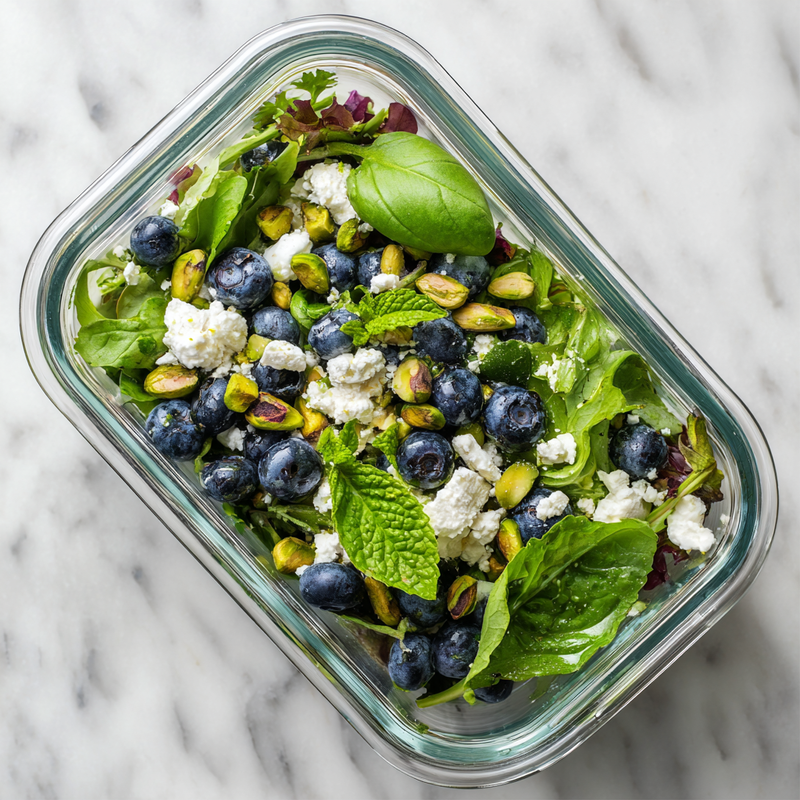 A vibrant, nutrient-packed salad featuring sweet blueberries, crunchy pistachios, fresh herbs, and crisp spring greens with a light lemon honey dressing. Perfect for meal prep and stays fresh all week.