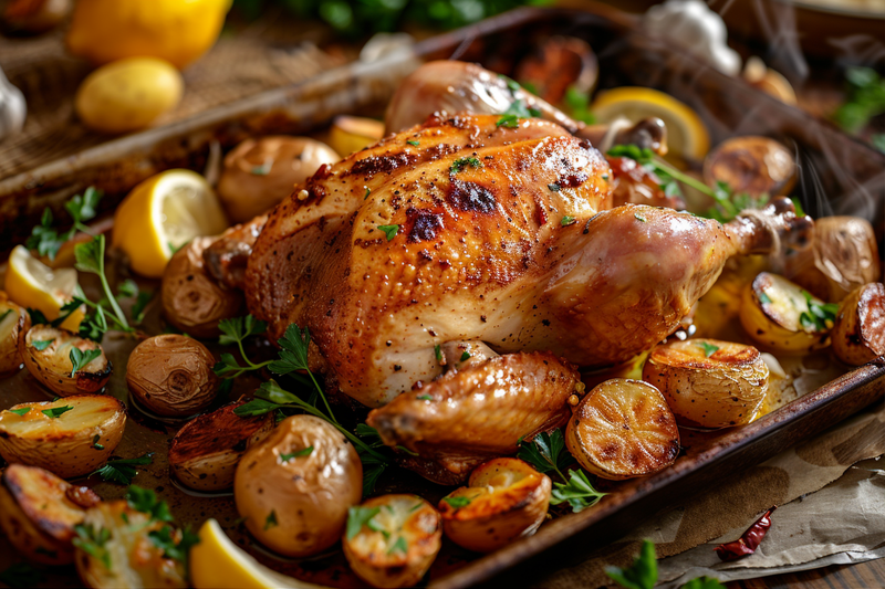 A complete roasted chicken with golden crispy skin and tender meat, served over caramelized baby potatoes infused with lemon, herbs, and pan drippings.