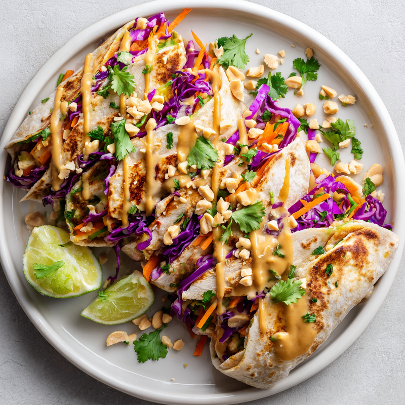Crispy vegetables, tender chicken, and creamy peanut sauce wrapped in soft flatbread. These Thai-inspired wraps are impressive yet simple to make.