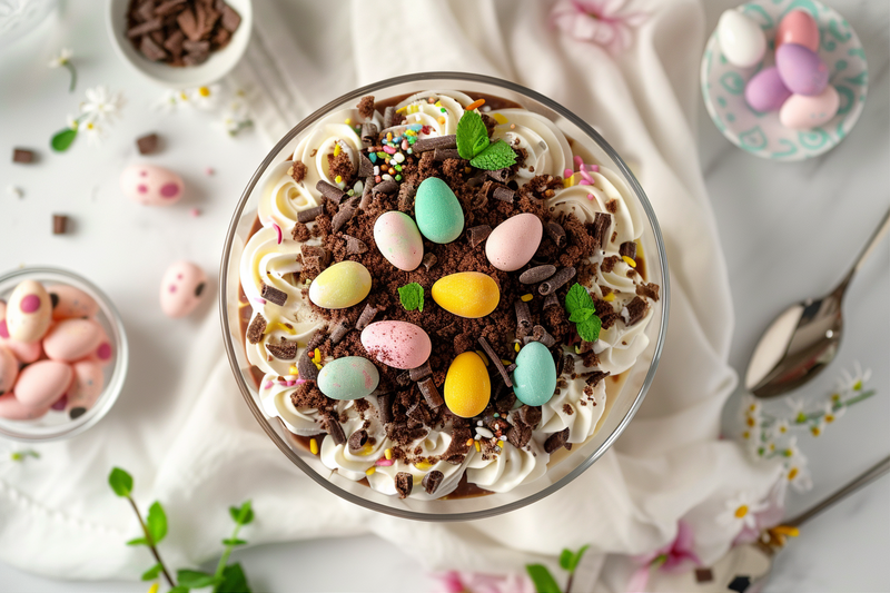 This dessert is a showstopper that looks impressive but requires zero baking skills and minimal hands-on time. Layers of rich chocolate pudding, fluffy whipped cream, and crushed chocolate cookies create a texture that's simultaneously creamy and crunchy. The magic happens when you decorate the top with colorful candy eggs and perhaps a few gummy decorations, transforming simple pantry ingredients into a festive centerpiece that'll have everyone asking for the recipe.