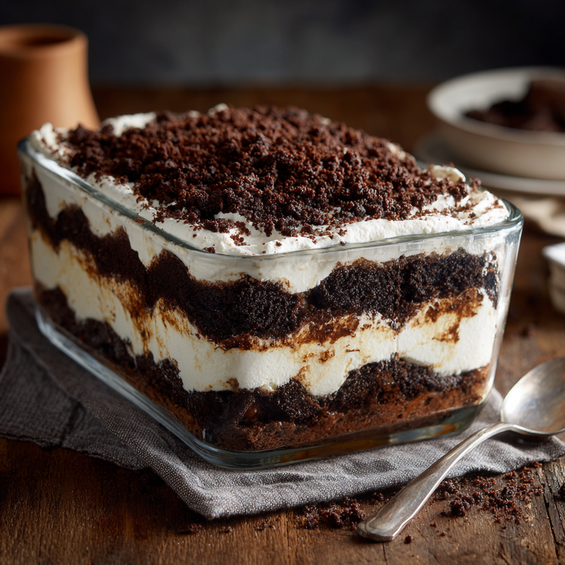 A crowd-pleasing layered dessert featuring chocolate sandwich cookie crumbs, creamy chocolate pudding, and fluffy whipped topping. Perfect for gatherings and completely no-bake.