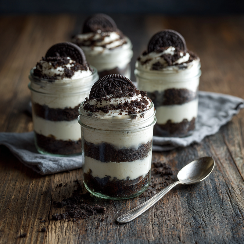 Individual layered dessert cups featuring crushed chocolate sandwich cookies and a creamy vanilla pudding mixture. A no-bake treat that's perfect for gatherings and can be made ahead.