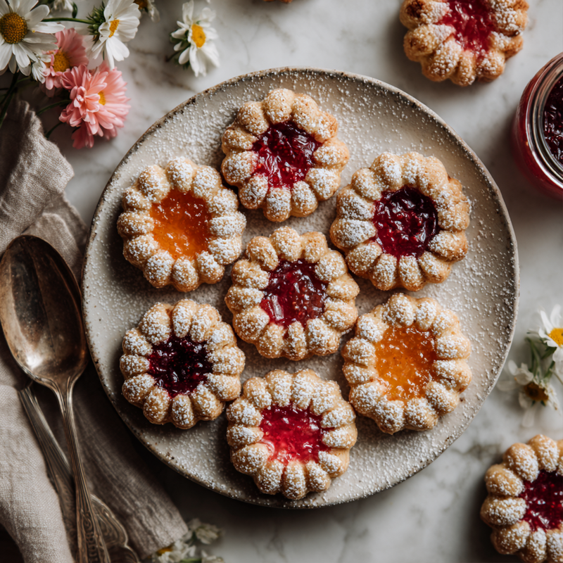 Buttery, tender thumbprint cookies filled with colorful jam and decorated with delicate flower patterns. A budget-friendly treat that looks and tastes bakery-quality.