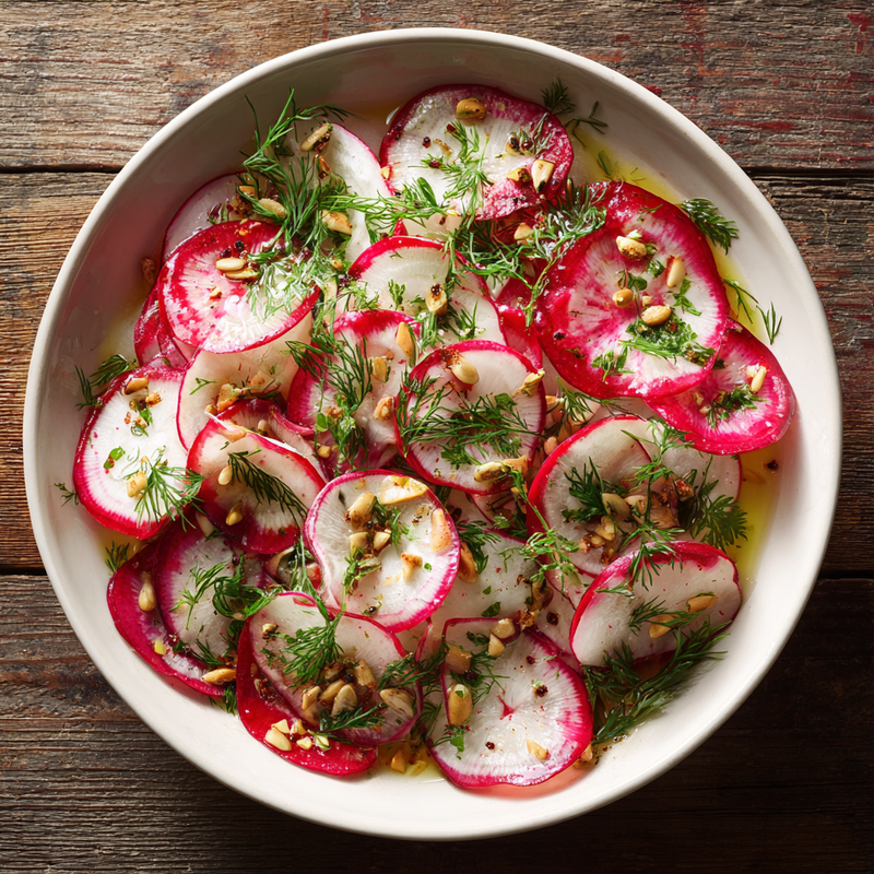 A crisp, vibrant radish salad featuring thinly sliced radishes, fresh herbs, and a bright lemon-Dijon dressing. Perfect for meal prep and stays fresh all week.
