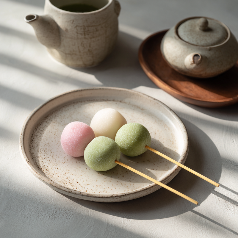 Authentic tri-color Japanese dango featuring soft, chewy rice flour dumplings in traditional pink, white, and green. Perfect for tea service and gatherings.