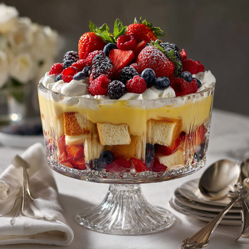 An elegant layered trifle with vanilla cake, silky custard, fresh whipped cream, and mixed berries. Perfect for special gatherings and completely make-ahead friendly.