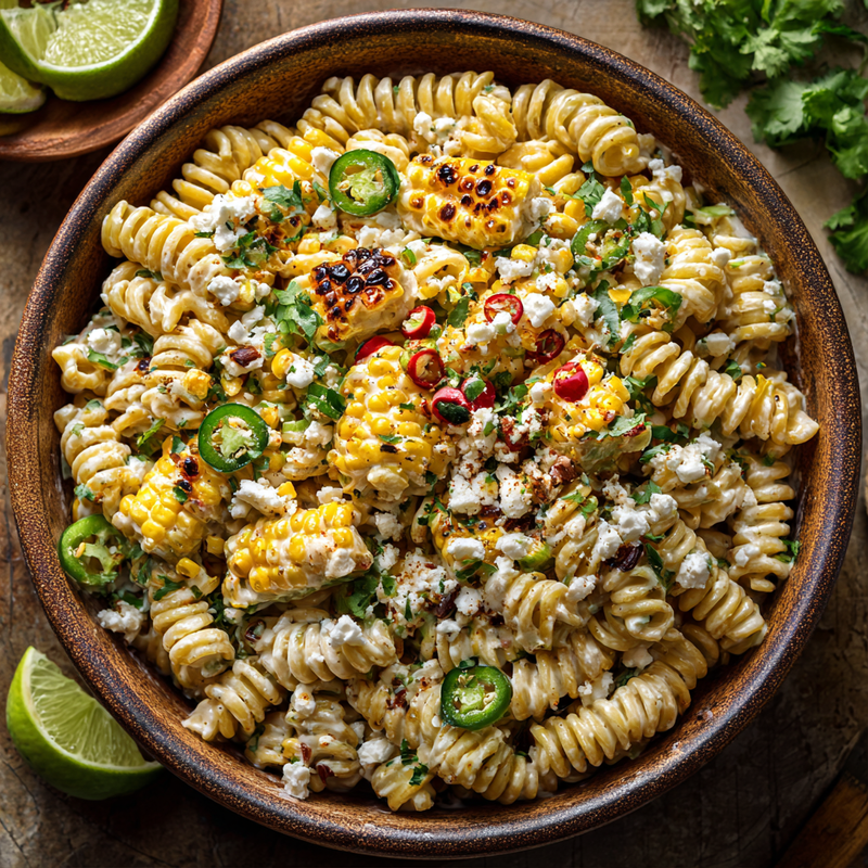 A vibrant, creamy pasta salad combining charred corn, tangy lime, and savory cheese with a smoky dressing. Perfect for gatherings and meal prep.