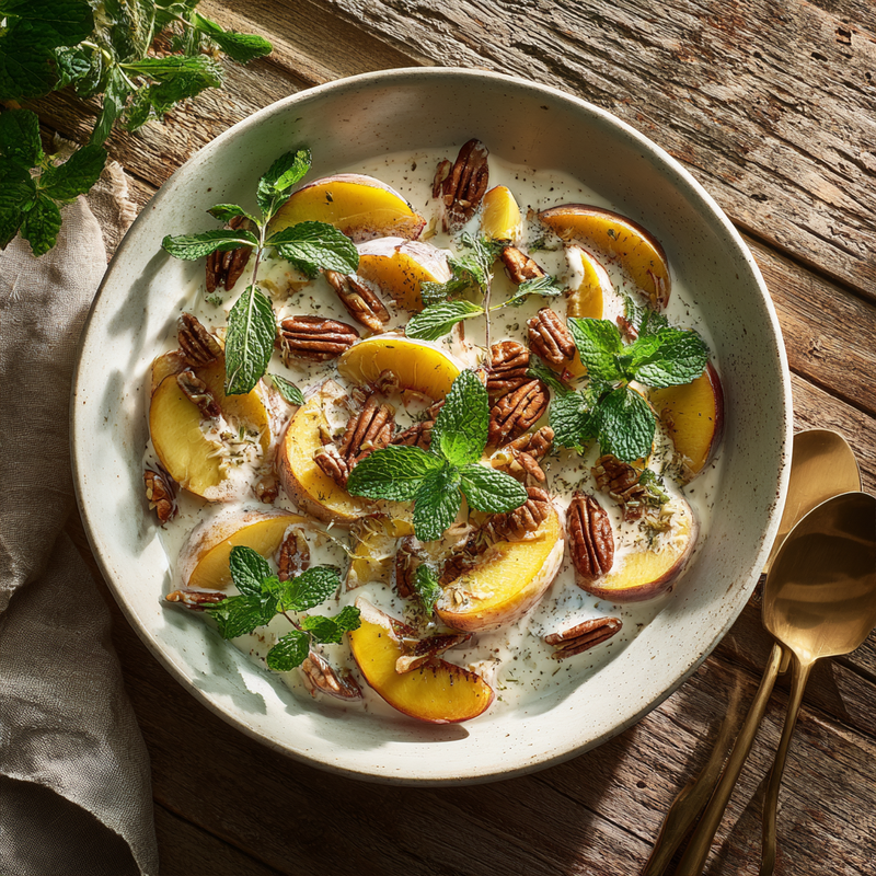 An elegant and indulgent salad featuring fresh peaches tossed in a creamy vanilla dressing and topped with toasted pecans. Perfect for gatherings and special occasions.