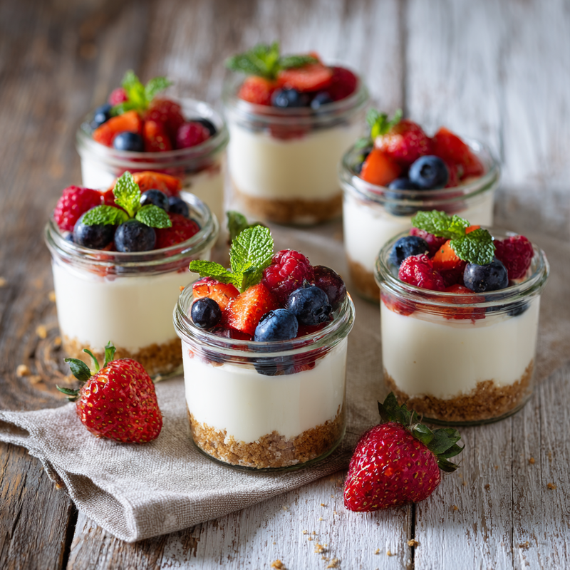 Creamy mini cheesecake jars with fresh fruit toppings. Perfect for spring gatherings and weekend brunches. No-bake option included!