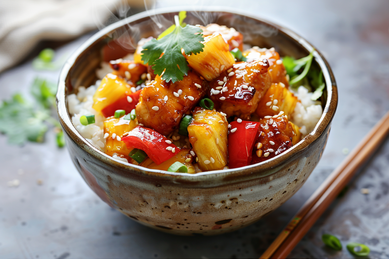 Korean-influenced pineapple chicken rice bowls incorporate gochujang (Korean chili paste) into the sauce for a spicy-sweet profile with fermented complexity. Kimchi served alongside provides probiotic benefits and cuts through the richness with its tangy, spicy character. Sesame seeds and sesame oil feature more prominently, and the dish might be garnished with crispy seaweed strips for additional umami and texture. The rice is often mixed with a touch of sesame oil and salt, making it flavorful even on its own. This version appeals to those who love bold, spicy flavors with layers of complexity.