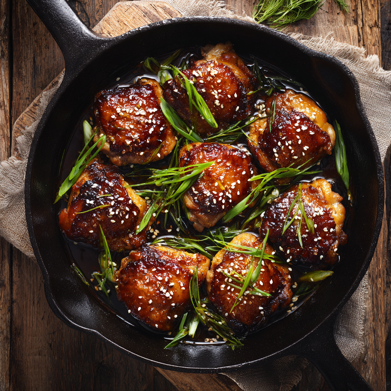Transfer the chicken thighs to a serving platter or serve directly from the skillet. Spoon any accumulated pan juices over the chicken for extra flavor and moisture. Garnish with sliced scallions and toasted sesame seeds before serving.