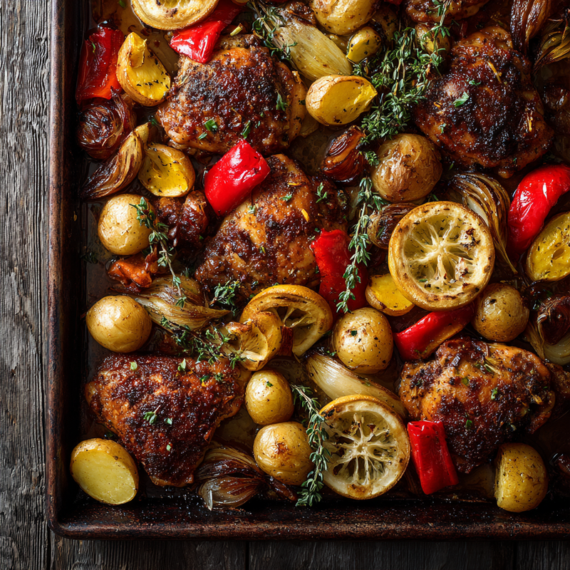 Juicy bone-in chicken thighs roasted with baby potatoes, bell peppers, and red onions, all seasoned with fresh lemon, garlic, and herbs. A complete one-pan dinner with minimal cleanup.