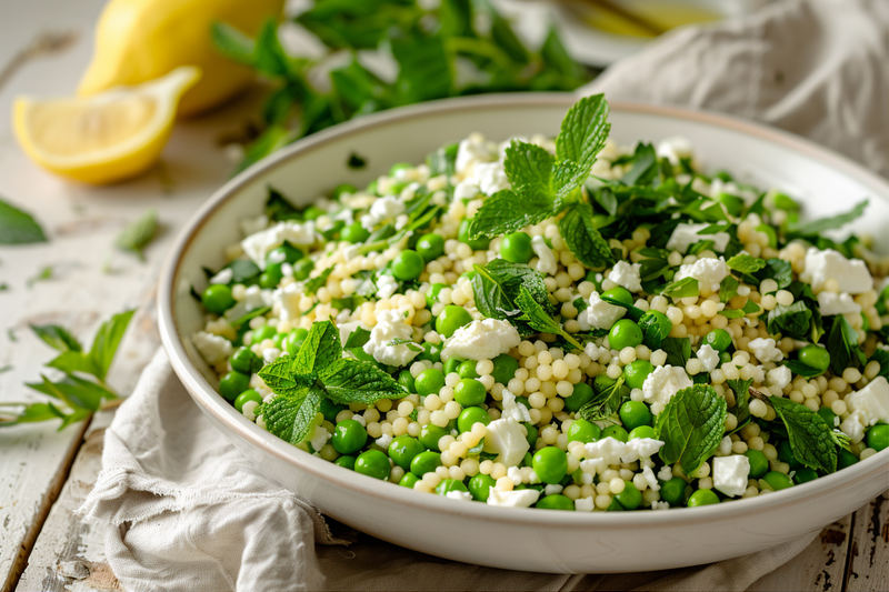 A fresh and vibrant couscous salad featuring sweet peas, tangy feta cheese, fresh herbs, and a bright lemon dressing. Ready in just 20 minutes, perfect as a light meal or side dish.