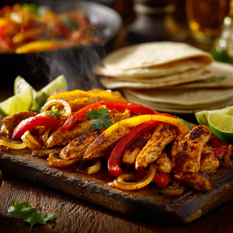 Slice the chicken breasts into strips approximately 1/2-inch thick, cutting against the grain for maximum tenderness. Slice the bell peppers and onion into similar-sized strips to ensure even cooking. Pat the chicken dry with paper towels to remove excess moisture.