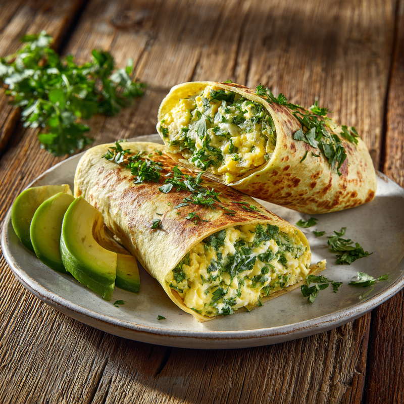 Nutritious and vibrant breakfast wraps featuring fluffy scrambled eggs blended with fresh spinach and herbs, wrapped in warm tortillas with melted cheese and your favorite toppings.