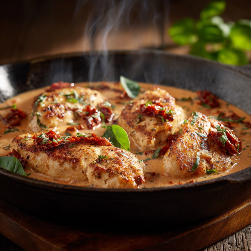 Tender pan-seared chicken breasts in a creamy sun-dried tomato sauce with garlic, herbs, and Parmesan. Ready in just 30 minutes using one pan.