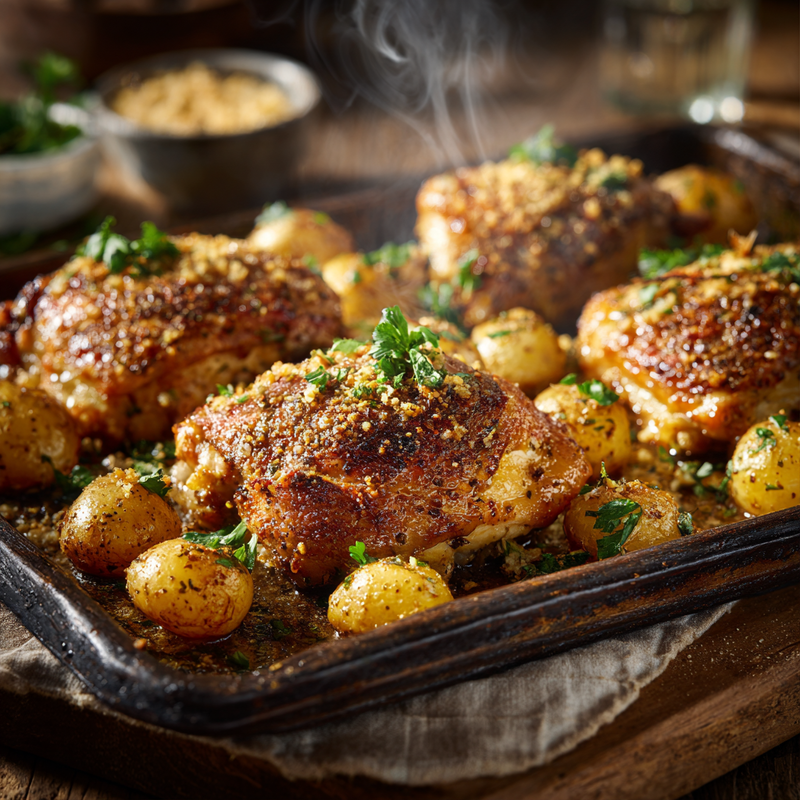 Tender, juicy chicken with crispy golden skin and roasted potatoes, all coated in garlic butter and parmesan cheese. This easy one-pan dinner is perfect for busy weeknights.