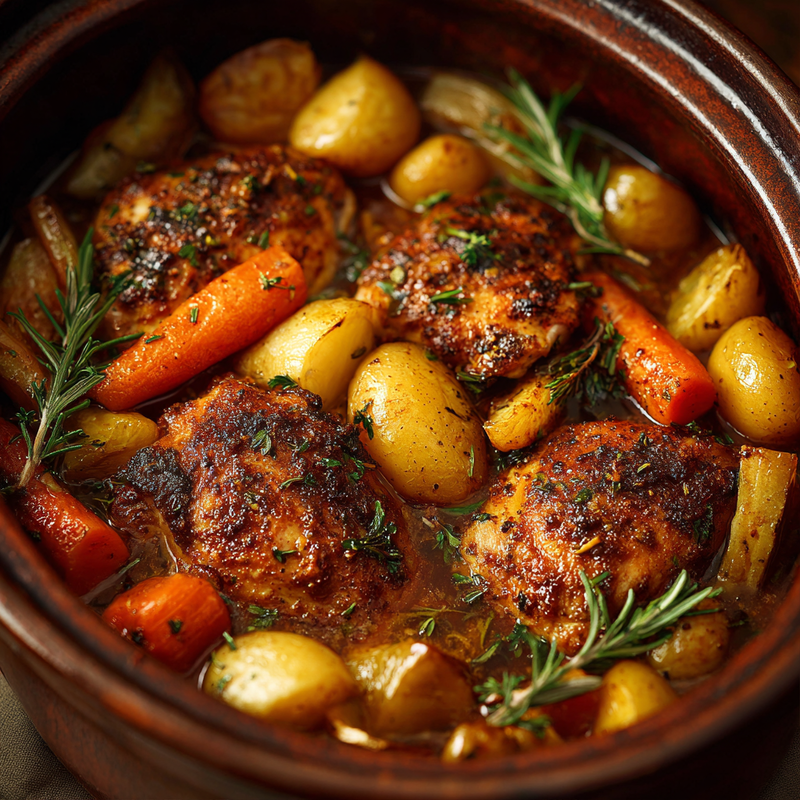 Recipe One: Classic Herb Chicken with Root Vegetables features bone-in chicken thighs nestled among carrots, parsnips, and baby potatoes, all infused with rosemary, thyme, and garlic. This quintessential comfort food develops a golden, savory sauce that tastes like hours of careful attention, though it requires only fifteen minutes of morning prep.
