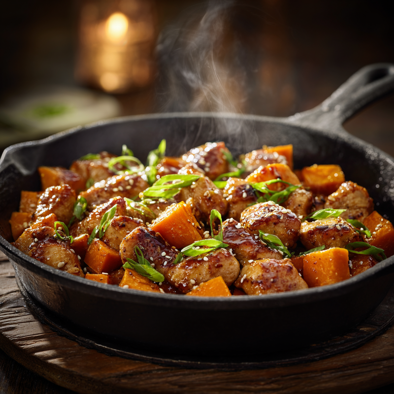 A quick 30-minute one-pan meal featuring tender chicken and caramelized sweet potatoes coated in a sticky honey garlic glaze. Perfect for busy weeknights.