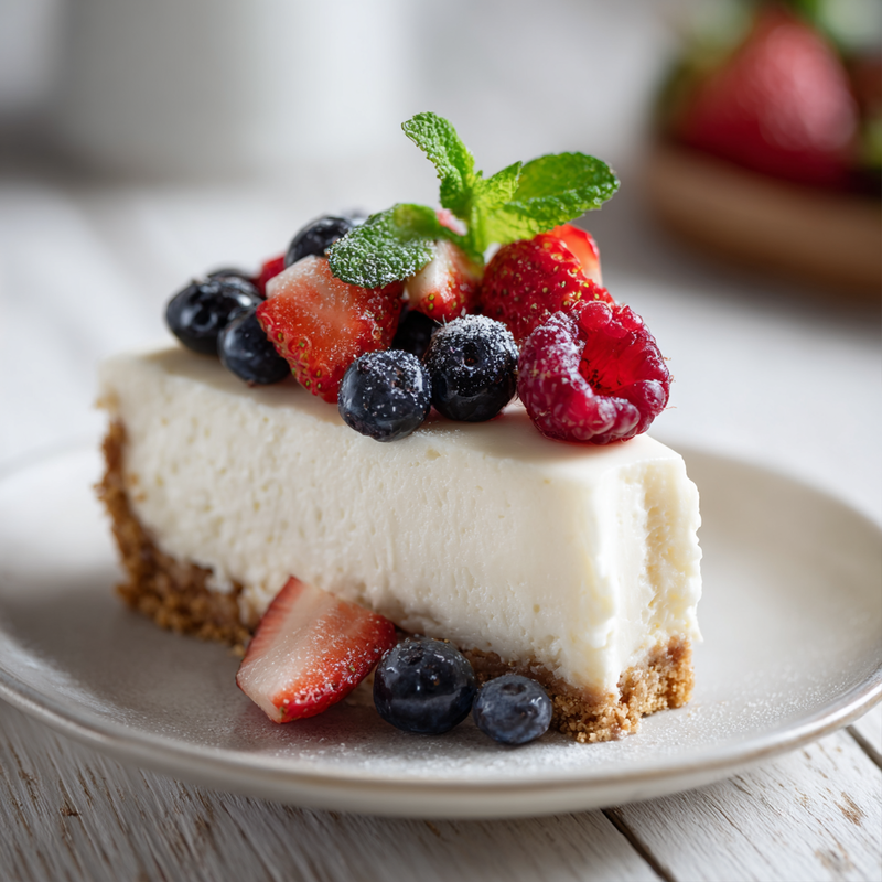 Top the cheesecake with fresh berries, a drizzle of fruit compote, or any desired toppings just before serving. Garnish individual slices with a sprig of fresh mint if desired. Serve the cheesecake cold directly from the refrigerator for the best texture and flavor.