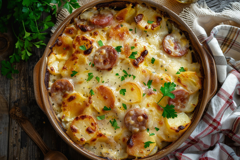 A hearty, comforting casserole featuring layers of tender potatoes, smoky kielbasa sausage, and melted cheese baked to golden perfection. Perfect for family dinners and gatherings.
