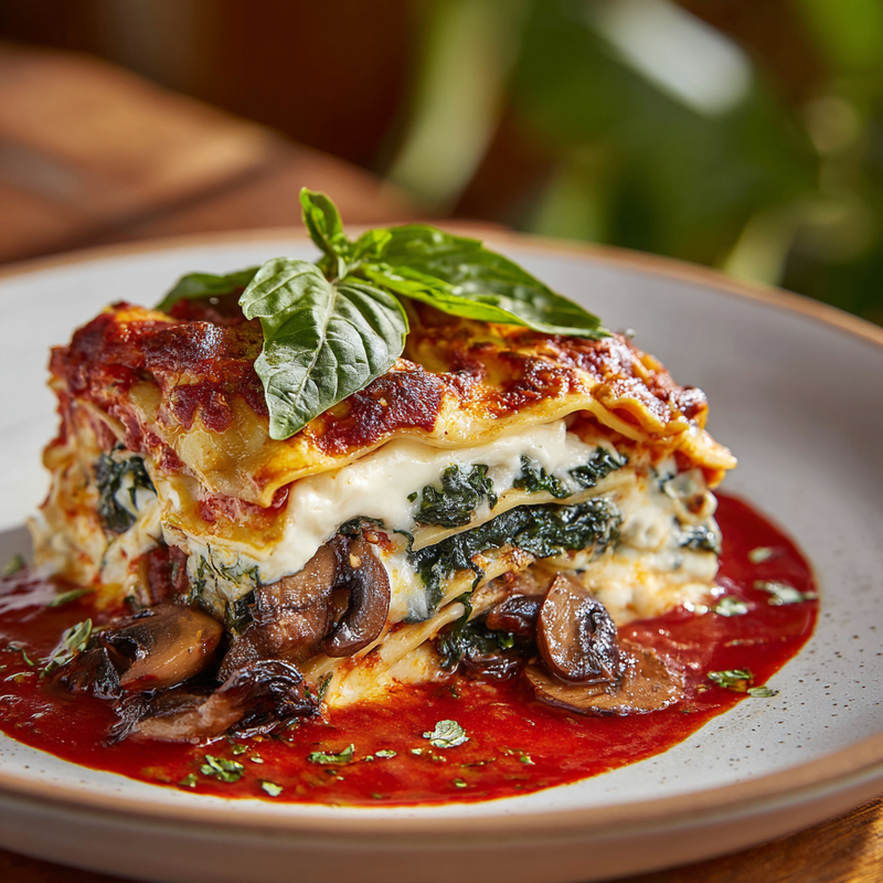 A rich and creamy vegetarian lasagna featuring layers of sautéed mushrooms, fresh spinach, three cheeses, and savory tomato sauce, baked until golden and bubbling.