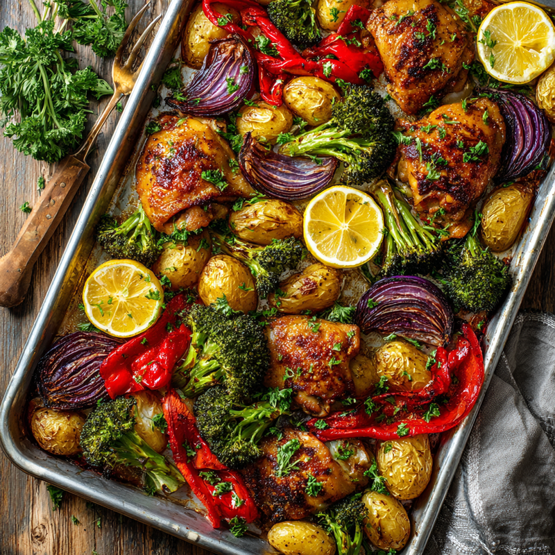 Remove the sheet pan from the oven and let everything rest for 5 minutes. This allows the chicken juices to redistribute, ensuring moist, flavorful meat. Squeeze fresh lemon wedges over the entire pan for brightness, and garnish with freshly chopped parsley. Serve directly from the sheet pan or transfer to a serving platter for a beautiful presentation.